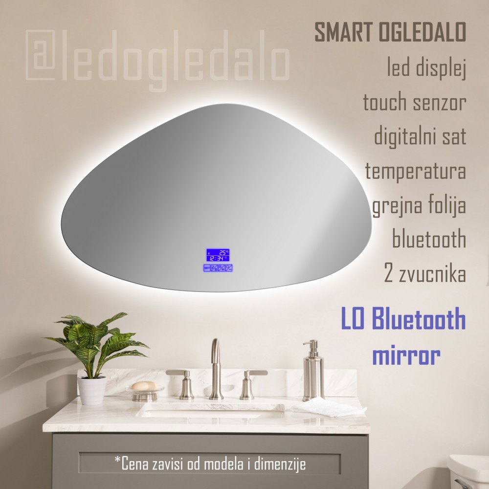 Ogledalo sa ugrađenim LO setom sadrži mini dispej koji poseduje rotirajući meni sa satom I temperaturom. Takođe, ogledalo poseduje antifog grejač ( 20x30cm ) koji se aktivira dodirom na naznačeno mesto I touch za paljenje osvetljenja sa mogućnosti promene inteziteta osvetljenja.